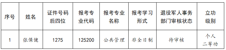 根据教育部《2026年全国硕士研究生招生工作管理规定》(教学〔2025〕2号)第二十五条“对服役期间获得三等功、二等功以上奖励或者二级以上表彰,符合全国硕士研究生招生考试报考条件的退役人员,可申请免初试攻读硕士研究生”,现将广东医科大学2026年立功表彰退役军人申请免初试攻读公共管理硕士研究生复试考生名单公布如下: